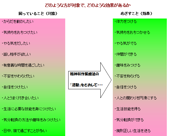 精神疾患により日常生活で支障がある方々に対し、さまざまなプログラムを通じて、その人にとって良い生活に近づける為の治療法の一つです。