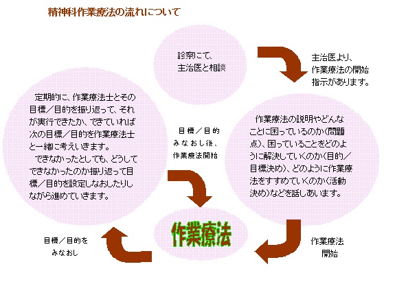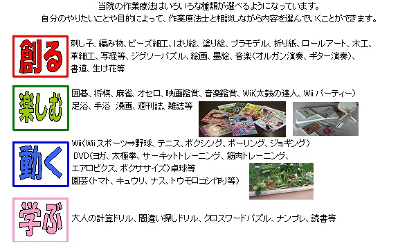 当院では、医師の処方箋に従って個別や集団での作業活動を行い、疾患により困難となった日常生活が取り戻せるようプログラムを実施しています。プログラム内容は患者様ご本人と担当作業療法士が相談した上で組み立てられます。