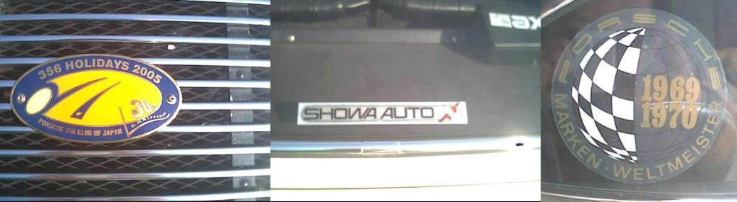 左から356クラブ30周年バッチ、デーラーであった昌和自動車のシール(71年ここから販売される)、ワールドチャンピオンシール