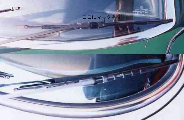オリジナルワイパーは、細くスタイリッシュであるが(マーク付)補修用ワイパーは厚く穴が開いている。