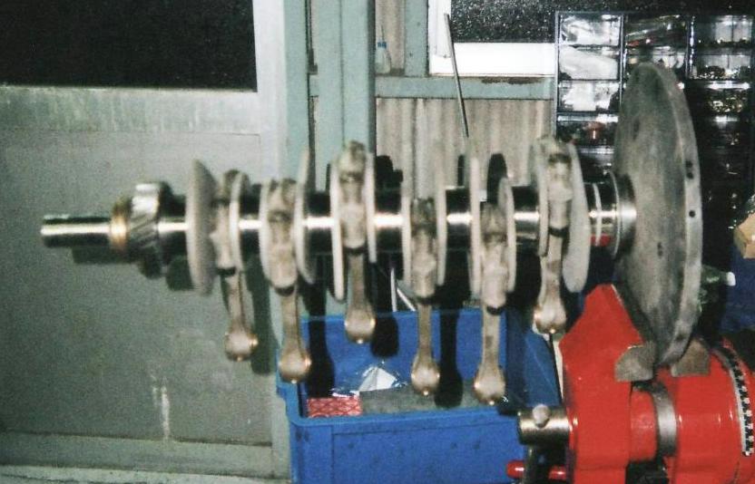 クランクシャフトの6箇所の凹みに6本のコンロッドが付く。フェラーリー12気筒では、6箇所の凹みに12本のコンロッドが付く。