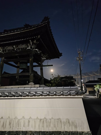 "西方寺の鐘楼と今日の名月。なかなか上手く撮れません。皆さんの近くの名月は?