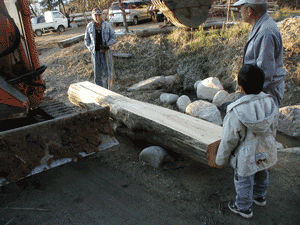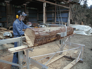 そこへ力強いお助けマシンが登場。イオン財団の助成により木材の横挽きができる可搬型の製材機ロゴーソールを導入づることができた。