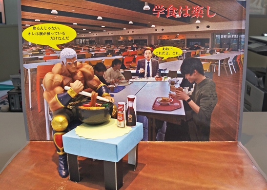 第一志望の大学に合格して、学食(学生食堂)にやってきたラオウくん。広い空間と大勢の大学生に囲まれて、気持ちがうわずり、えも言われぬ焦りを押さえながら、ラーメンを食べようとしています。上半身に浮き出た血管がその緊張感を如実にあらわしています。