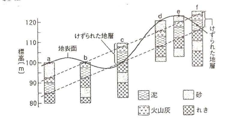 【13,地層】 13,地層 確認 (1)風化 (2)侵食 (3)運搬 (4)堆積 (5) V字谷 (6)扇状地 (7)三角州 (1)大きい粒 (2)大きい粒 (3)大きい粒 (4)沈降 (5)隆起 (6)新しい層 (1)露頭 (2)柱状図 (3)かぎ層 (4)化石を含む層(火山灰の層) (5)ボーリング 練習問題 1, (1)ア,エ (2) A・扇状地 B・ V字谷 C・三角州 (3)ウ (4)堆積 (5)イ 2, (1) A・ウ( Bより浅いから) C・ア( Bより深いから) (2) 大きく(遠く)なっていった。 ア(はじめはれきで、深くなるにつれて砂,泥の順に堆積する。) 3, (1)エ (2)ア(粒が大きいものほど速く沈むので、底のほうかられき→砂→泥の順に堆積する。) 4, (1)露頭 (2)大地の変動(土地の隆起や沈降)が起こるから。 (3)ア,オ (4)イ 5, (1)丸みを帯びている (2)三角州 (3)E (4)エ(粒が小さいものほど、沖のほうへ堆積する) (5)プレート 6, (1)ボーリング試料 (2)火山灰(火山灰は広範囲に堆積するため) (3)かぎ層 (4)エ (5)c,f(この地域の地層は、下図のように広がっている。)(6)エ 7, (1) A・火山岩 B・深成岩 (2)風化 (3) マグマ 隆起