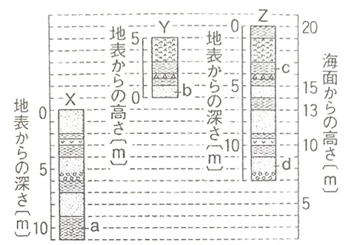 【14,堆積岩・化石】 14,堆積岩・化石 確認 (1)粒の大きさ (2)れき岩,砂岩,泥岩 (3)丸みを帯びている (4)2mm以上 (5)0.06mm以下 (6)遺がい (7)石灰岩 (8)凝灰岩 (9)角ばっている (1)示準化石 (2)広い範囲 (3)示相化石 (4)限られた環境 (5)中生代 (6)中生代 (7)新生代 (8)古生代 (9)浅くて暖かいきれいな海 (10)湖や河口 (1)上の層 (2)火山の噴火 (3)泥岩 (1)海岸段丘 (2)断層 (3)プレート (4)多島海 練習問題 1, (1)ウ (2)粒の大きさ (3) A・れき岩 B・砂岩 (4) C・石灰岩 D・チャート 2, (1)B (2)ア (3)示相化石 (4)凝灰岩 (5)名称・アンモナイト 年代・中生代 (6)ウ 3, (1)G (2)ア (3)E (4)生息範囲が広く、限られた期間に生存していた。 (5) A, B, C( Cでは新生代の化石であるビカリアが見つかっているので、その上の層は新生代である。) (6)イ(新生代でない化石を選ぶ。) 4, (1) B,C (2)動物の足跡,ふん (3)ウ (4)示相化石 (5)れき岩 5, (1)B (2)ア (3)エ 6, (1)エ (2)3つ (3)6m (4)ウ,オ 7, (1)浅い海 (2)2回 (3)a→d→b→c(火山灰の層をかぎ層として、地点 X Zの柱状図を 新注文中1 P1945 層の高さをそろえて表すと、下図のようになる。)(4)14m(地点 Xの海面からの高さが13mだから、 X・ Zの火山灰の層の下面は10m, Y・ Zの軽石を 含む火山灰の層の上面は16mである。よって、地点 Yの海面からの高さは、162=14m)