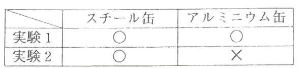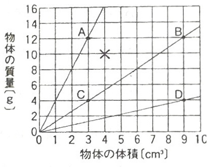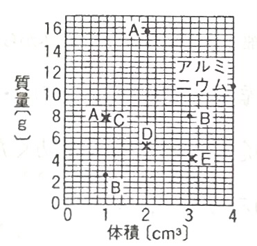 (3)3倍(実験1の1回目で体積が1.0のとき、切片 Aは7.9g, Bは2.7gだから、7.9÷2.7=2.9…倍) (4)右図 (5) B, D(図2にかいた・や×と原点を結ぶと、同じ物質は同じ直線上にある。)