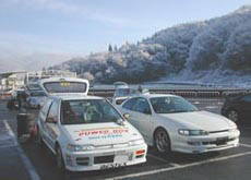| 何とか無事到着〜。時刻は8時・・1時間遅れの受付だから9時で良いはずなんだけど、 当初の予定通りの時刻に着いちゃいました。ちなみに到着は2番手でした。 そのうちうるさい音が聞こえてきたかと思うと、ヨシオさんでした(笑。 ちゃーんとスタッドレスで来てたのでヨシオさんはYZの坂道をパワフルに駆け上る。 いつの間にか裏門が開いてたので、うめカレンともう1台はそっから入ることに。 車を停めてコースを見渡すと・・真っ白! YZのスタッフの方が早くからコースを整備してくれてるみたいだけど、明らかに凍結してる(汗。 circuitというより、スキー場にでも来てるんじゃ!?ってくらい雪に囲まれた景色でした。 9時が近づくにつれ、車が続々と・・。車種も様々、走行車両は56台にもなった模様。 |
