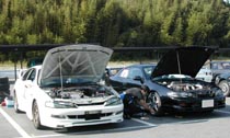 | コースインし久々のMLSの感触を確かめるも、やっぱりまだ怖い気持ちを持って走っている自分がいた・・そう簡単に開き直れない。 実は、8月6日にトヨタ車だけの走行会があって、走らんかったけど見学だけはしに来てました。そこでMR2乗りの竹内さんに同乗したりして いろいろ教わっていたから、それを今回実践してみようと思い、ライン取りやブレーキの使い方など思い出しながら走行を続けてみた。 うめカレンのパッドは3mmを切ってて、ガンガン使うとヤバそうな感じ。走行会の前までに交換したかったけど、時間が無くて間に合わなかったので、 外周やヘアピンで突っ込まないことに自分自身で気を付けて走るしか無かった。結構長い間走行したかのように思え、カレンちゃんの油温はワーニングが 点灯してきた。ピットインするかしないか微妙な感じで走行を続けた。やっとチェッカーが振られピットインする。「結構時間長かったね〜」と3人で休憩。 自分の今さっきの走りがどれくらいのタイムで走ってきてたのかが気になった・・それはもちろん他の2人も同じだった。 タイムは各グループの走行が終わってからまとめて張り出されるようで、ひとまず雑談しながら次の走行枠の時を待つことにした。 |