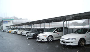 | 朝起きると辺り一面の景色が違ってた!それに半端無い寒さ(>_<) ・・ホントに雪積もっちゃった。。 遠方からの参加車両にはきつい天候やろなぁ・・そう思いつつ、途中控えめに給油、昼食もやや控えめに買い込み、いざ南コースへ。 まだ10台ほどしか来てないっぽい。停めるとこは決まってないように思えたんで、とりあえず空いてるピットにカレンちゃんを納めた。 それにしても寒い・・外に出たくない・・震えながらボチボチ走行準備を始めた。 |