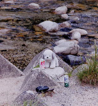 御在所岳ふもとを流れる川原で水遊び・・させようかと思ったら怖がって入ろうとしない。